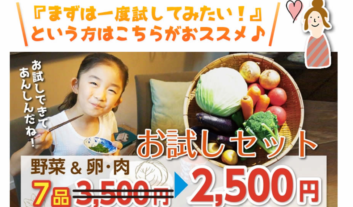 このお試しセットでは、旬の無農薬野菜やこだわりの食材など7品・約7,500円相当の内容が、2,500円で体験できます。