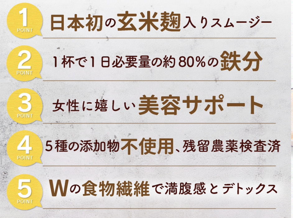 このスムージーには、玄米麹に加えて106種類の植物発酵エキスや18種類の雑穀が配合されています。